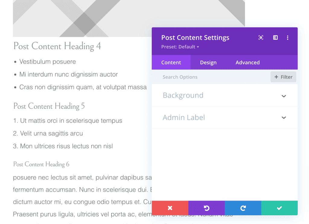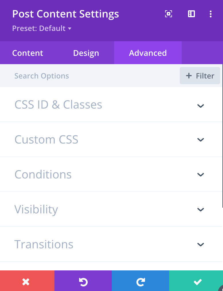 When you open the Post Content Settings, you will see 3 tabs at the topβContent, Design, and Advanced. You will want to select the “Advanced” tab.